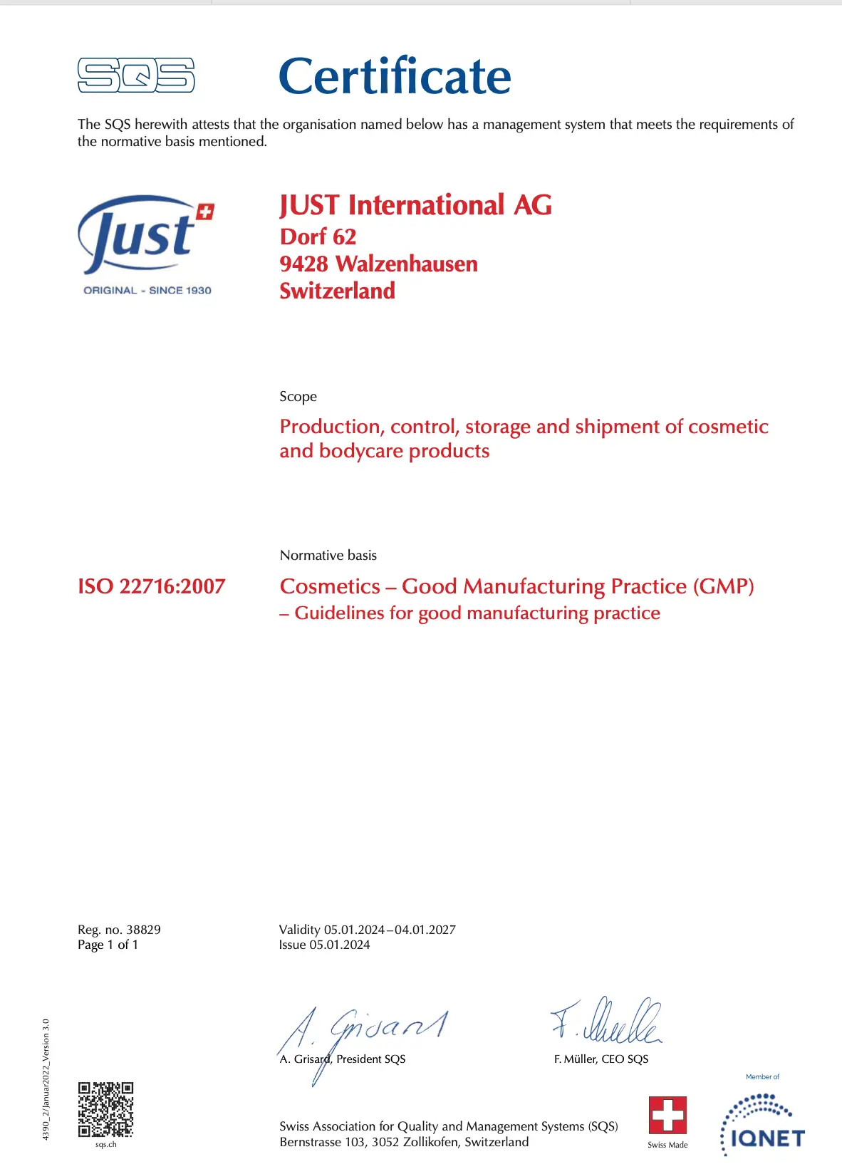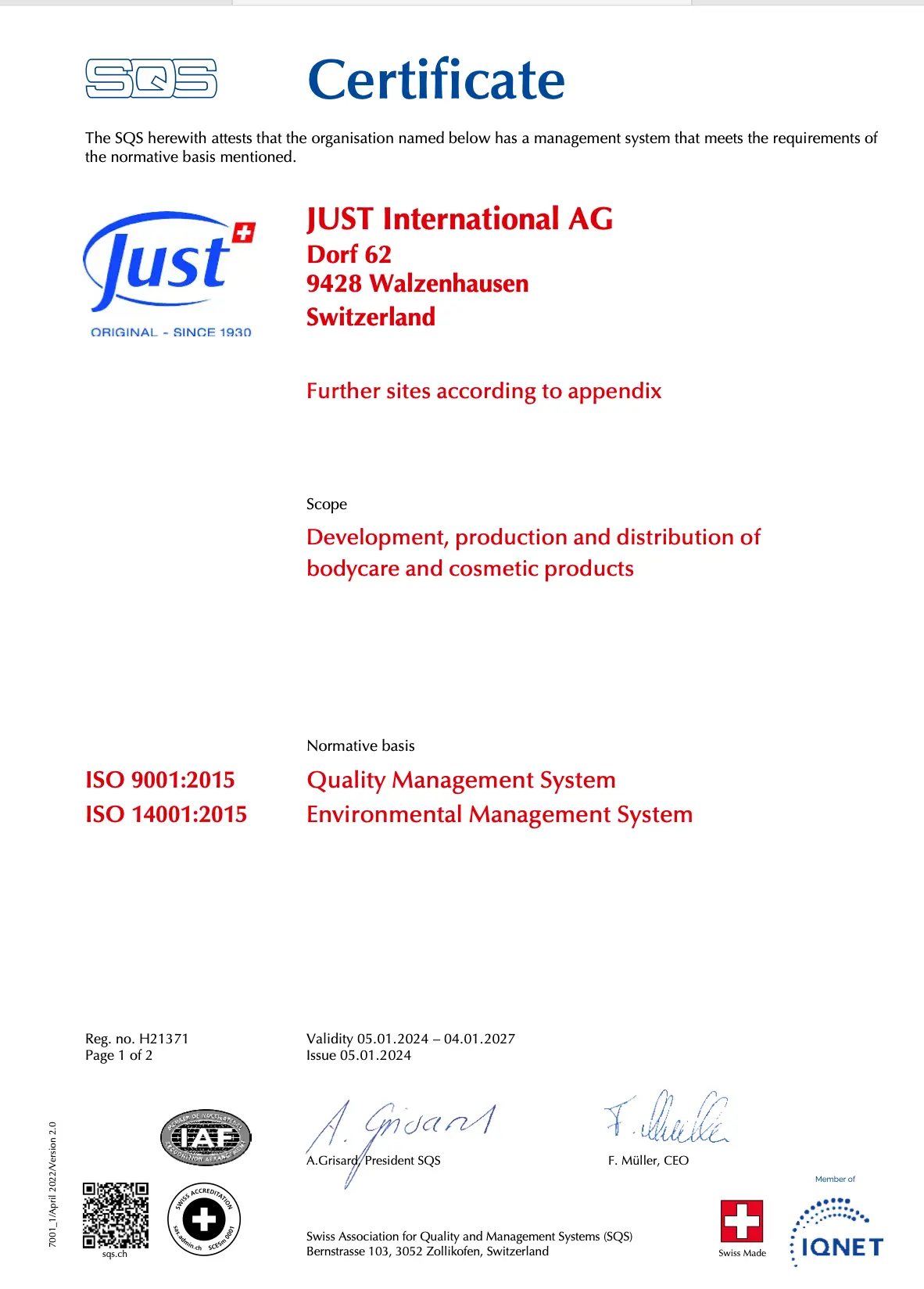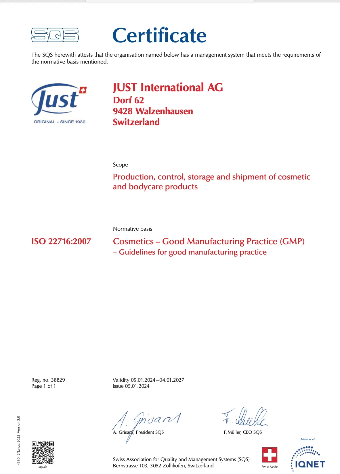 JUST products are meticulously crafted in Switzerland, utilizing state-of-the-art production facilities and rigorous quality control measures overseen by dedicated professionals